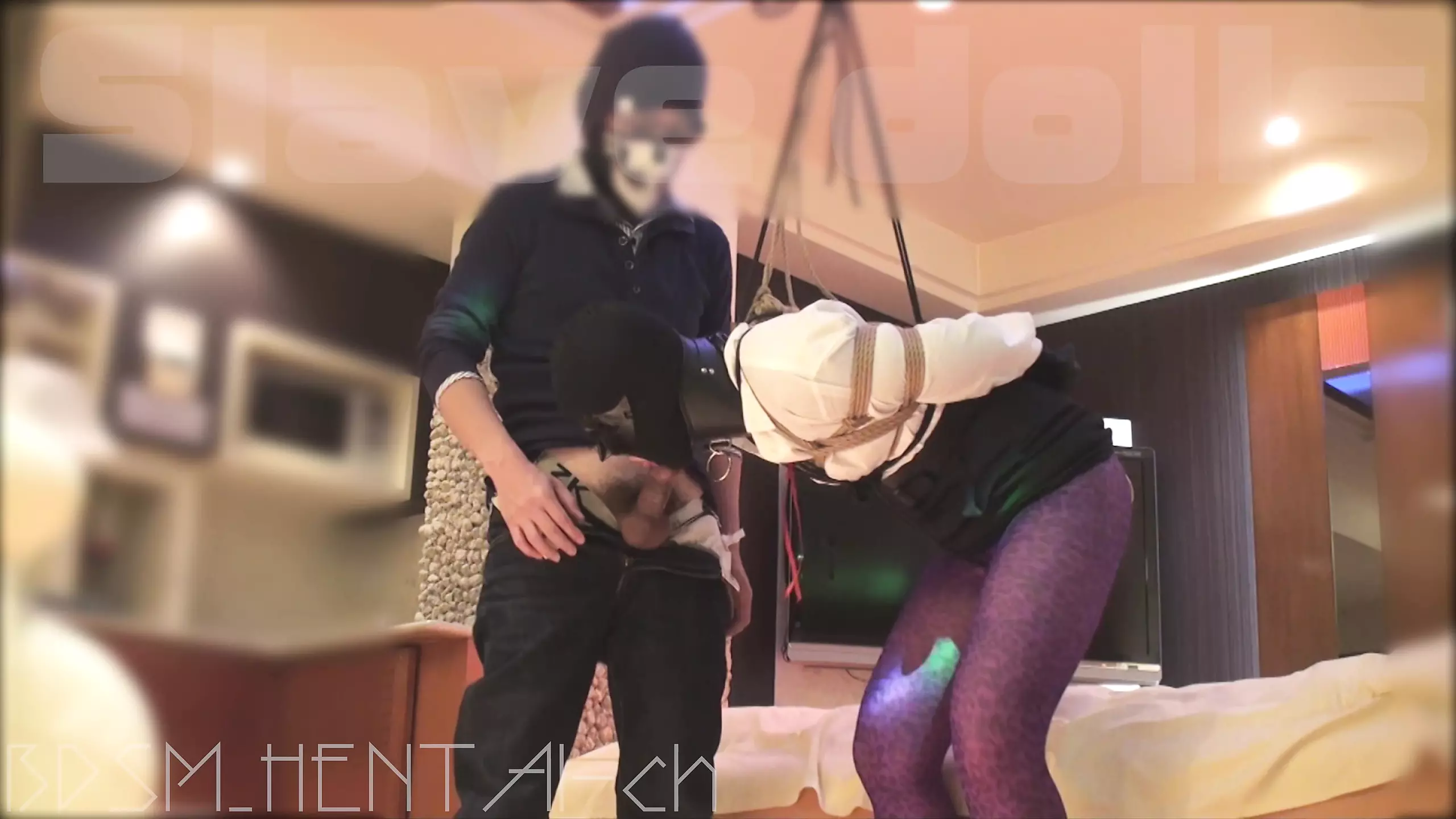 A female slave hung with an anal hook and a crotch rope... sucking a cock... thrusting into a pussy. Continue at the fan