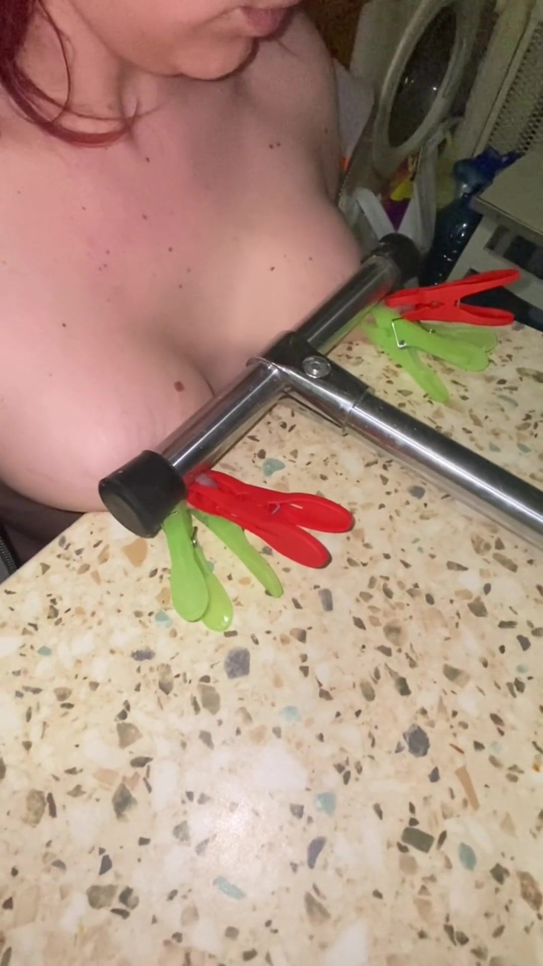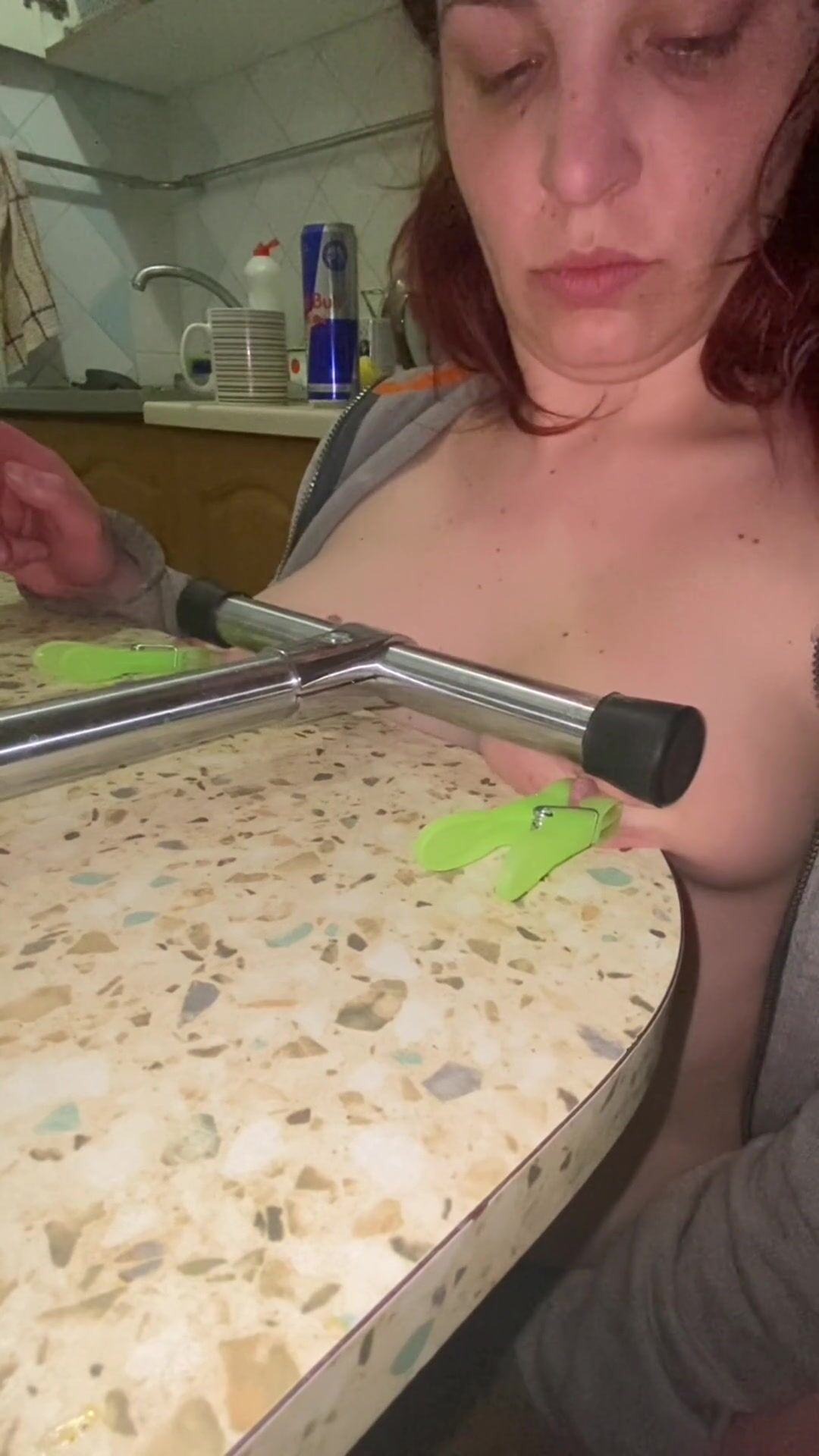 Pressing tits and nipples with a heavy tube, nipple clamps, while rubbing my pussy