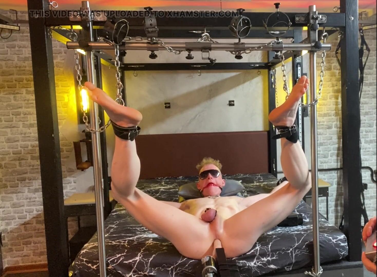 The gay slave is obviously in chastity and fucked by an increasingly fast fuck machine