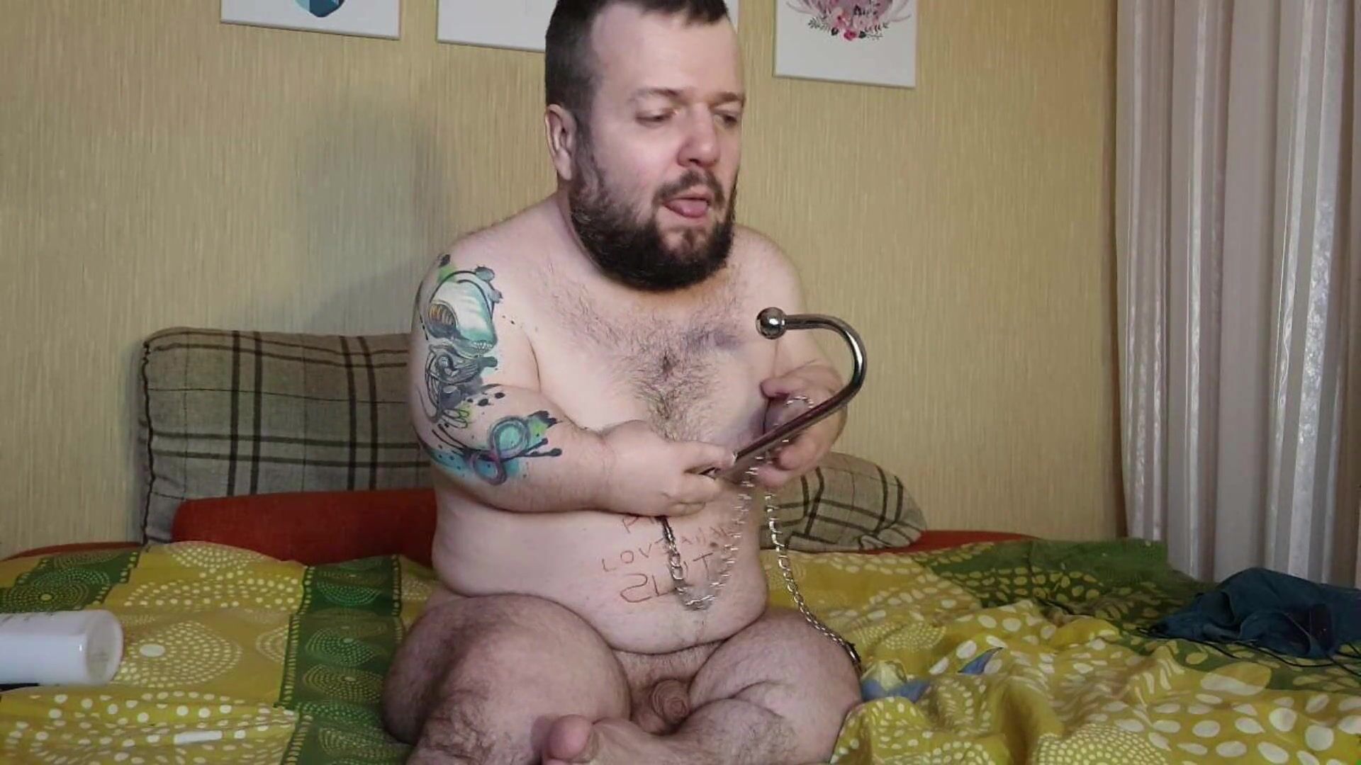 Midget humiliates himself in front of the camera, shows his body, asses and dick. And then penetrates his anal with a steel hook!