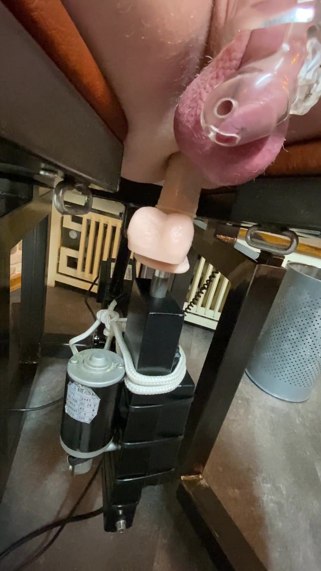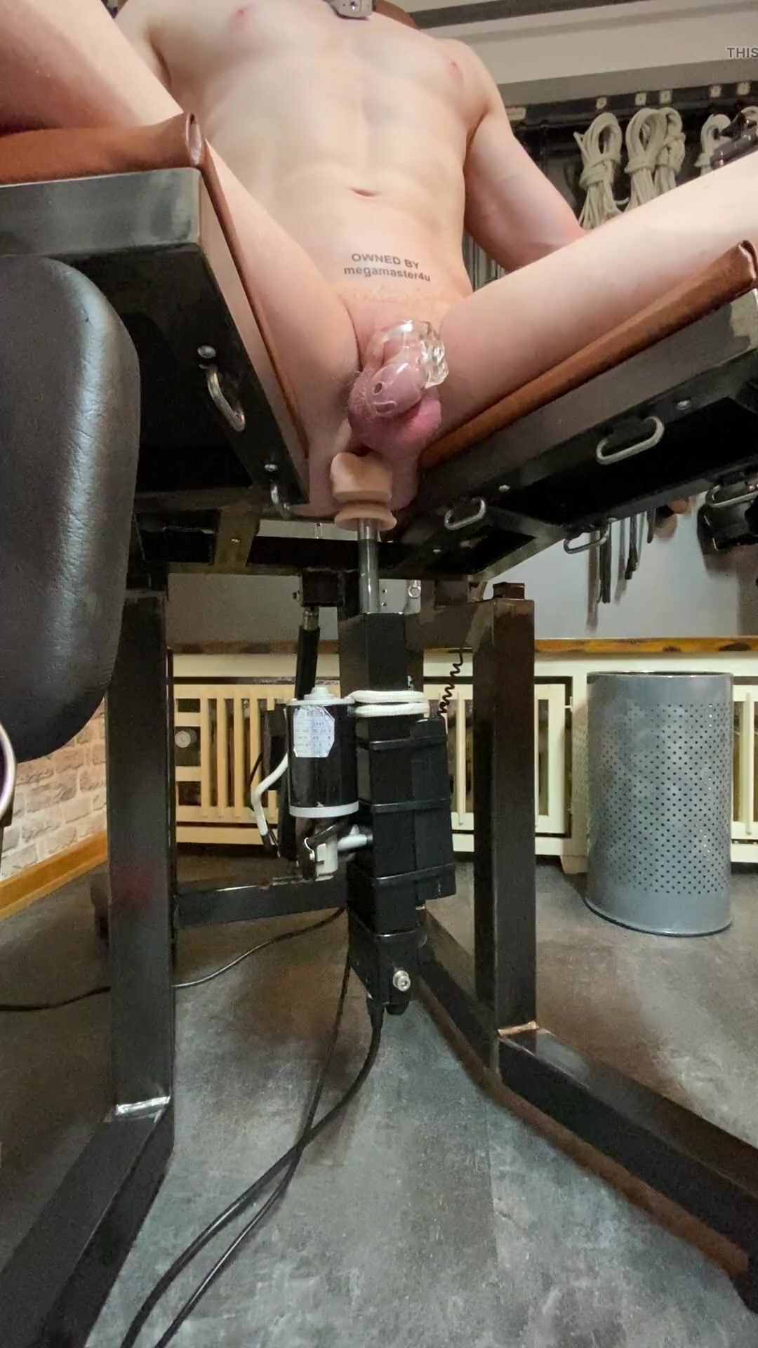 s2mm4u is locked in chastity while being fucked by a large dildo on a fuck machine and tied up in a rigid iron and steel chair