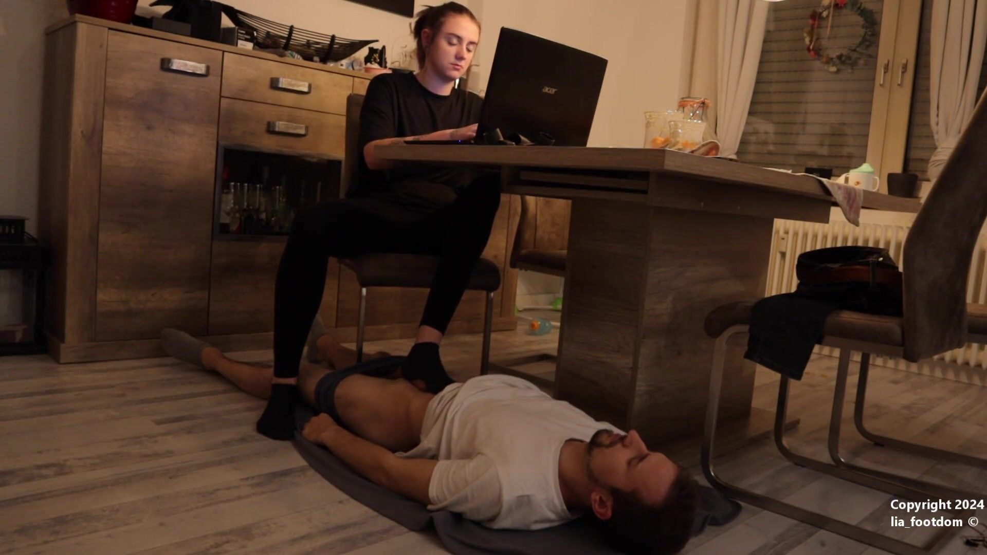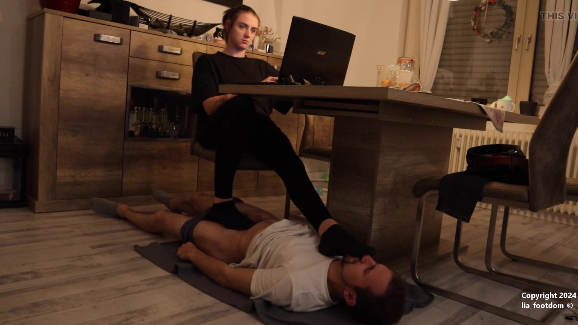 While I work, my noble feet must not touch the ground. This is a condition for my foot slave. That's why he always has to lie down under me and I can put my feet anywhere I want. And sometimes, I still cross my legs to put more pressure on his cock